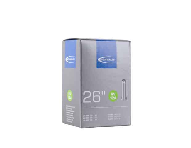 Schwalbe binnenband Smal 26 Inch Auto – AV12A/25-559, 28-559, 32-559, 35-559, 37-559, 40-559. De Schwalbe binnenbanden zijn betrouwbaar. Fietsdetaillisten waarderen hem om zijn hoge betrouwbaarheid. Iedere band wordt in de fabriek opgepompt en zo 24 uur op luchtdichtheid getest. De band houdt de luchtdruk langer vast. In de productie vereist Schwalbe een zeer hoog butyl aandeel en een zeer hoge reinheid van het materiaal. Zo houdt de Schwalbe binnenband de luchtdruk beduidend langer vast dan andere binnenbanden. Het is een groepen-binnenbandsysteem: Een Schwalbe binnenband is extreem elastisch en past op meerdere bandafmetingen. Hierdoor worden ze groepen binnenbanden genoemd. Zo past bijvoorbeeld de binnenband met nummer 19A voor bandafmeting van 27.5 inch tot 29 Inch en voor de breedte van 40 tot 62mm. Als laatste is de band 100% volledig recyclebaar. Standaarduitvoering: Hoge betrouwbaarheid, al vele jaren beproefd.