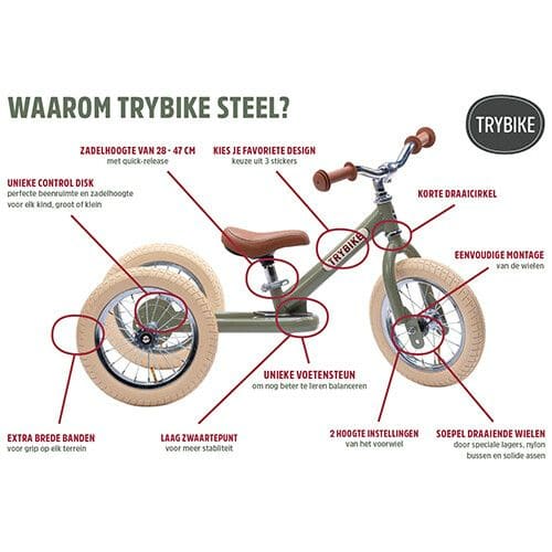 Met de Trybike Steel Petrol Blauw 2-in-1 word leren fietsen wel heel erg leuk en makkelijk. Dankzij de drie wielen biedt de Trybike veel stabiliteit, wat de loopfiets geschikt maakt voor kids vanaf 1,5 jaar. Is je kindje toe aan een loopfiets met twee wielen? Bouw de Trybike dan eenvoudig om naar een tweewieler. Deze stoere retro Trybike met prachtige blauwe kleur is de ideale loopfiets voor zowel jongens als meisjes. Dankzij het in hoogte verstelbare zadel (30-45 cm) gaat de fiets nog langer mee.